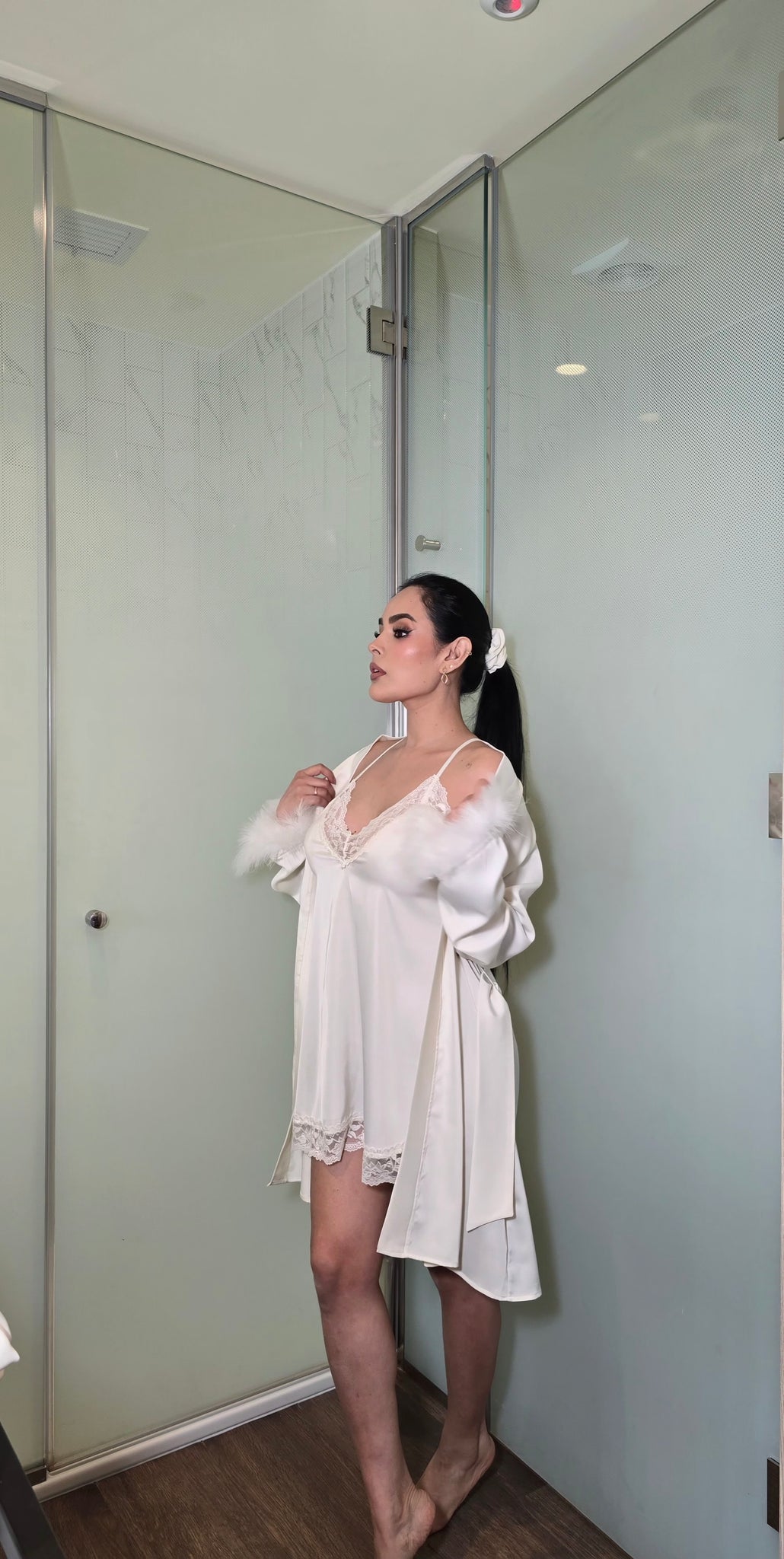 Hecho en seda francesa con encaje de algodón y plumas.
